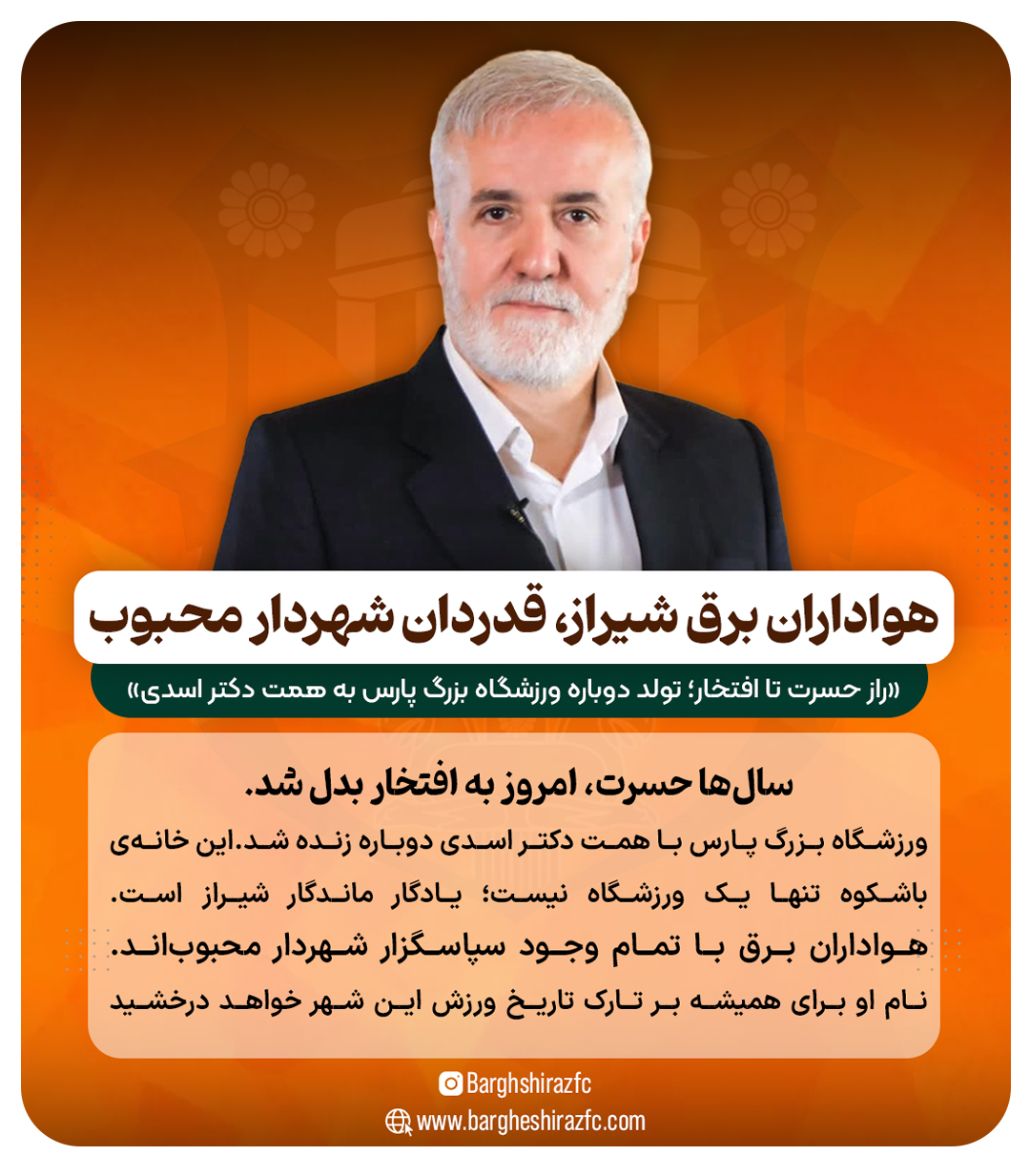 سالها حسرت، امروز به افتخار بدل شد. ورزشگاه بزرگ پارس با همت دکتر اسدی دوباره زنده شد.این خانهی باشکوه تنها یک ورزشگاه نیست؛ یادگار ماندگار شیراز است. هواداران برق با تمام وجود سپاسگزار شهردار محبوباند. نام او برای همیشه بر تارک تاریخ ورزش این شهر خواهد درخشید
